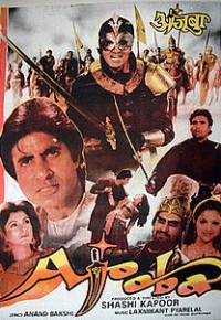 Ajooba is a masked rider in black (rather like Zorro) who thwarts the Vazir's lackeys as they pillage the lands and harass the citizens. His plain self is Ali, an ordinary restaurateur, and his chum is Hasan (Rishi Kapoor). Together they foil the Vazir's evil schemes, raid his caravans, and woo their girls. Ajooba, as Ali, falls for Rukhsana (Dimple Kapadia, actually the daughter of Ameer Baba, returned from Hind to rescue her imprisoned father), while Hasan's affections are for the Vazir's Shehzadi Henna (Sonam).